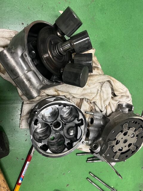 写真の上真ん中と左はのコンプレッサはピストンのロッドが折れていました。エアコンオイルはきれいな状態です。この車は高圧が上がらない症状でした。