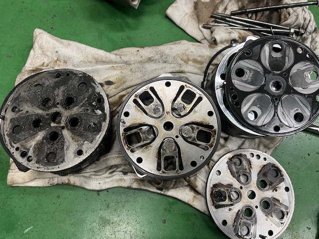 右上と大きい写真はピストン上部にある通気弁です。写真下ののコンプレッサはピストンロッドが折れてたものです。通気弁が正常です。真ん中と左のコンプレッサは弁が無い状態や折れた状態でした。両方ともマグネットクラッチが破断していました。オイルも焼けて真っ黒に汚れています。