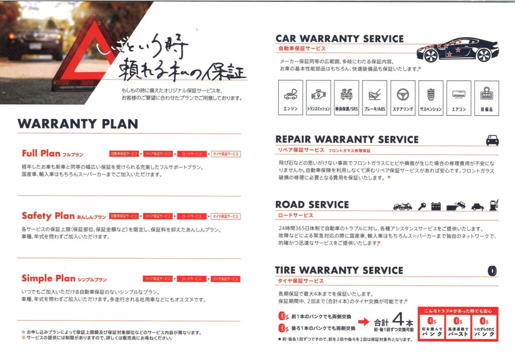 SAFUTY PLAN=フルプランに加入できないお車にも万が一の整備保証をするサービスです。初年度からの経過年数および走行距離は問いません。安心プランは保証金額が10万・30万・50万・100万までの4種類。補償対象部位(89点もしくは100点)によって保険金額が異なります。こちらもフロントガラス修理(年間最大5万円)と無料ロードサービス(15㎞まで)がついています。